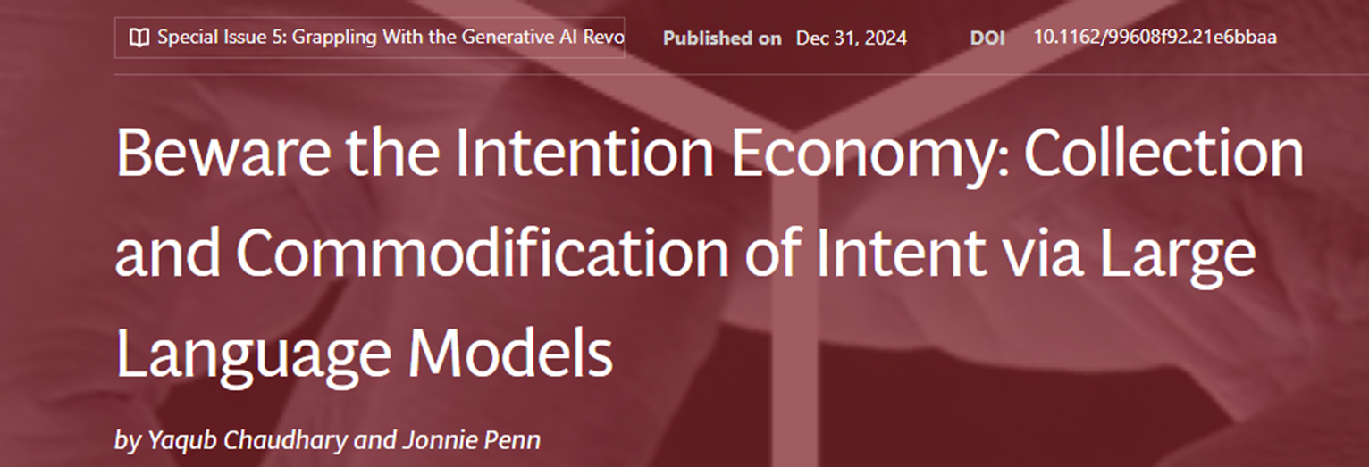 [2] Chaudhary, Y., Penn, J. (2024). Beware the Intention Economy: Collection and Commodification of Intent via Large Language Models. Special Issue 5: Grappling with the Generative AI Revolution. Harvard Data Science Review.